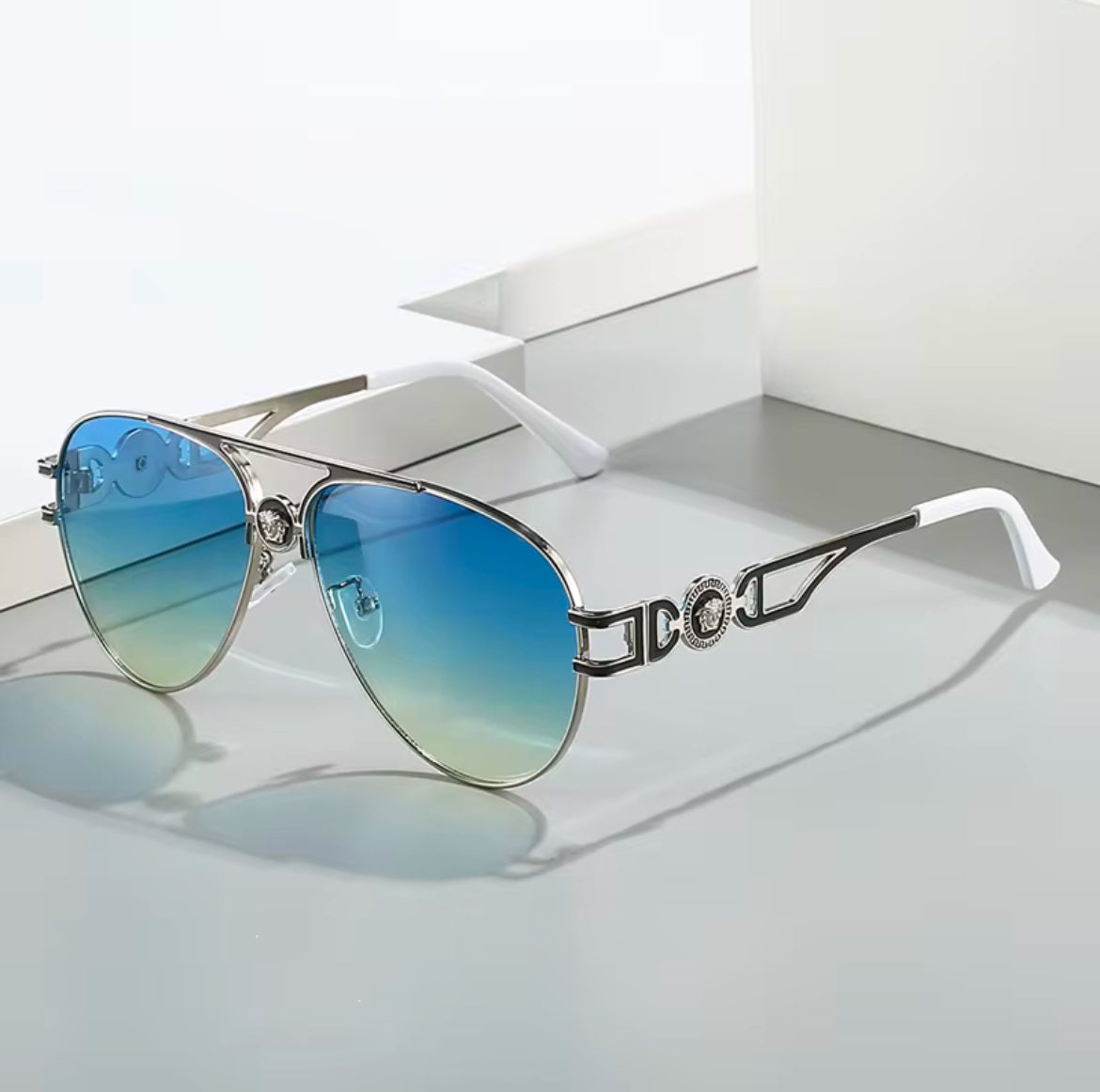 These aviator sunglasses feature a sleek silver metal frame and stylish gradient lenses. The temples are adorned with a repeated decorative element and a circular medallion, adding a touch of sophistication.